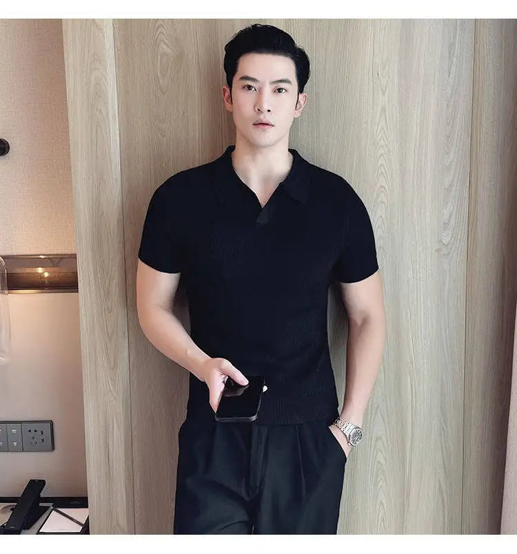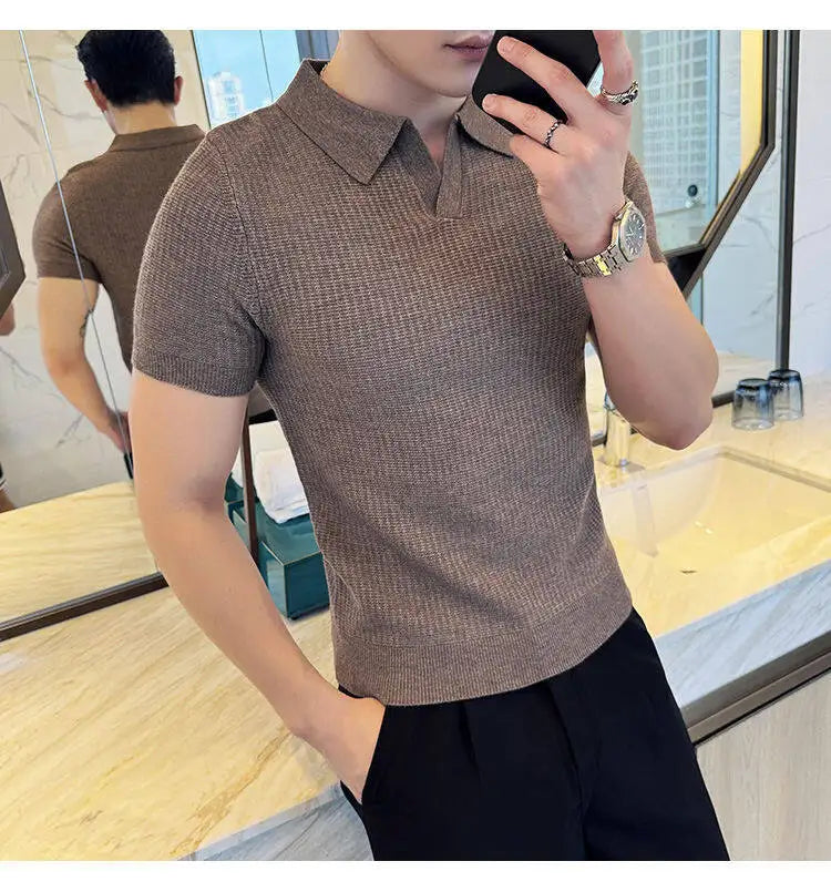 Men's Slim Fit Polo Collar Jacquard Knit Sweater - Beige, Gray, Brown Black, Modern Base Layer for Casual & Formal Wear T-shirt