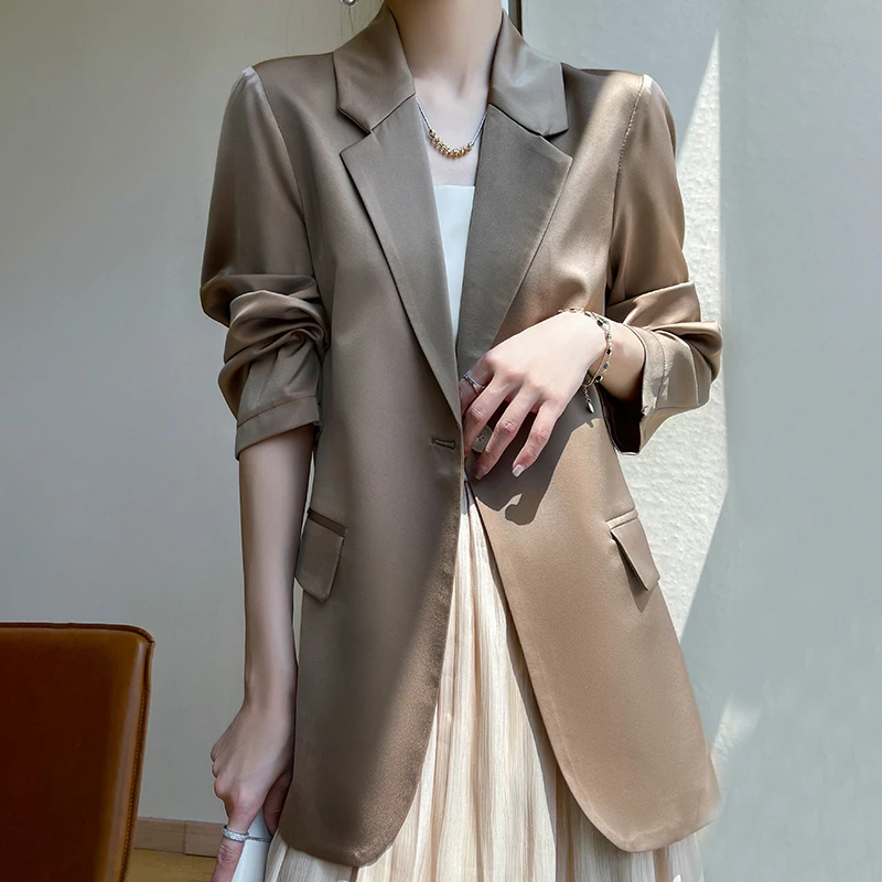 Women Blazers Spring Summer New Fashion Korean Silk Satin Suit V-neck Loose Top Jacket Single Button Suit Blazers Outerwear