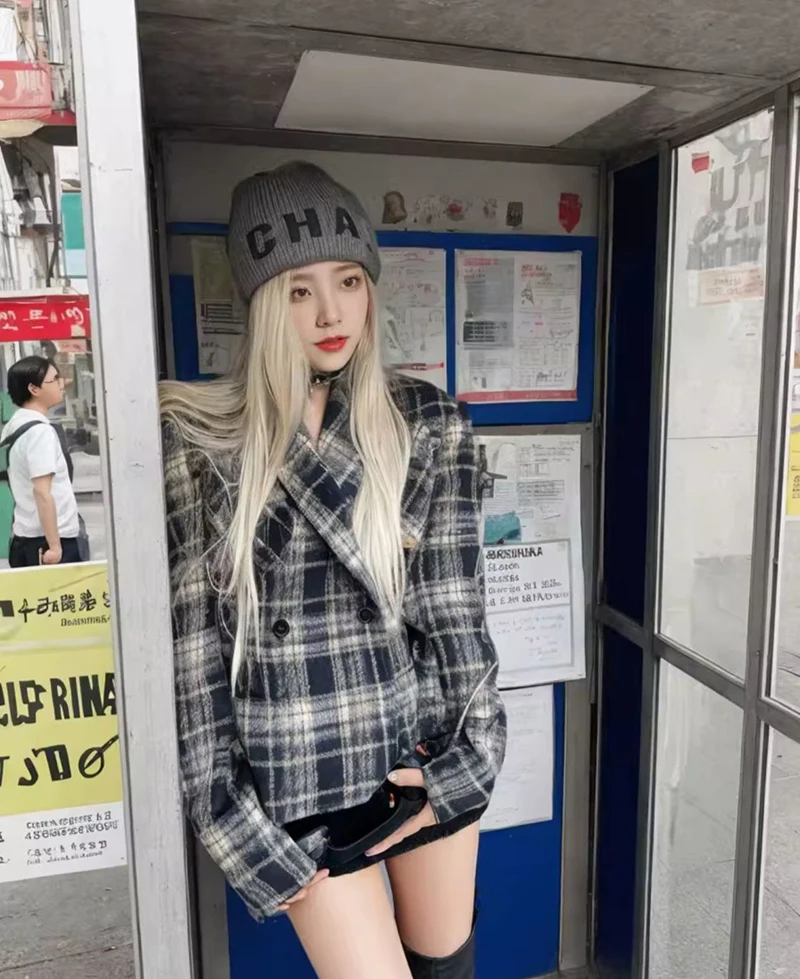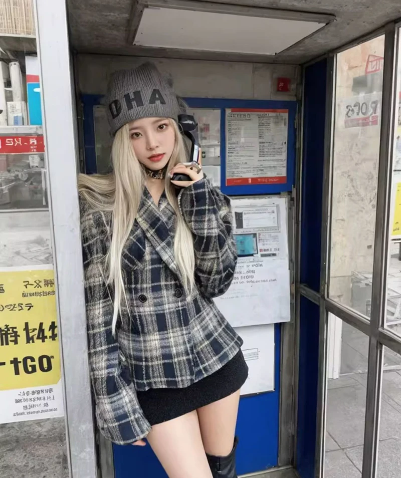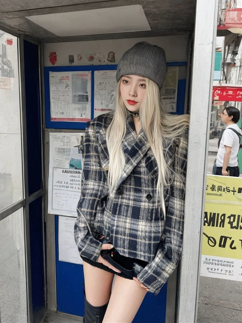 Women Vintage Plaid Blazers Long Sleeve Button Slim Fit Office Lady Suit Jacket American Retro Streetwear Casual Woolen Coats